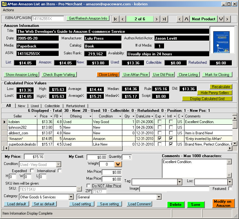 To edit a Pending Upload, simply double click on the Pending Uploads tool in the Inventory Management section. A screen similar to the one below will appear. If the item you are editing is an existing listing, some of the fields such as SKU and condition cannot be edited. Once you are happy with the changes, you may click on Modify to cause the change to take place immediately or click on Save to save your changes in Pending Uploads and move to the next item. Saved changes may then be uploaded using the steps in Upload Inventory to Amazon.