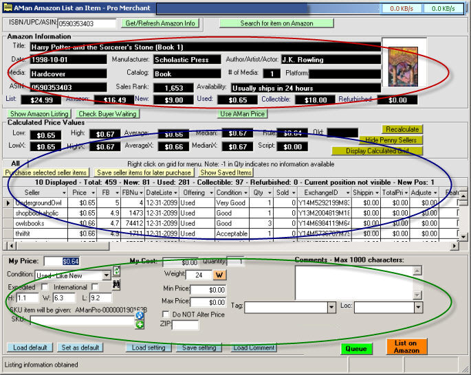 The Red area displays the Amazon information for the item. The Blue area displays the AMan calculated prices including averages and a list of the lowest sellers. The Green area is the area to enter your details for the item.