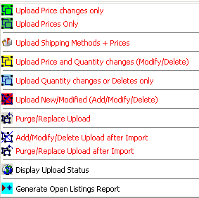 Upload Price Changes Only - This is the safest and fastest upload.. Only items whose prices have changed are upload and only the price is sent up. Other values such as quantity, comment etc are not uploaded. This means that if an order comes in during the pricing process, the wrong quantity will not be upload to Amazon. Please note that if you have made changes to fields such as quantity, comments etc, only the items that have changed prices will have those changes moved back to Active Listings. This upload may only be used with existing items.