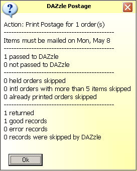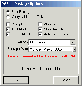 You will prompted with the DAZzle prompt which will allow you to change the options that you have previously configured (see Configuring Endicia DAZzle within AMan)