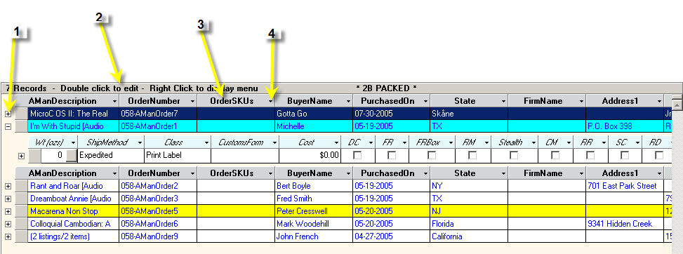 The AMan Grid is the main data display in the product. This is used for all of the Order Fulfillment, Listing and pricing functions. The data in the grid may be sorted by any of the columns and the columns may be moved to suit your viewing pleasure. Each functional display (e.g. orders awaiting to be packed, listings etc) may have its own grid display layout.