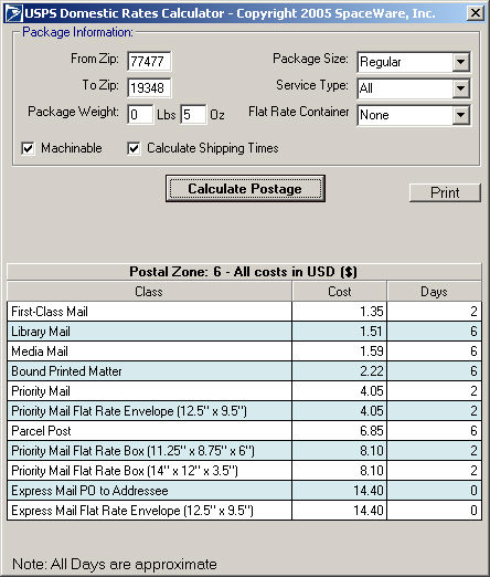 The Postal Rates display will appear with the shipping costs and, if configured, the approximates shipping times.